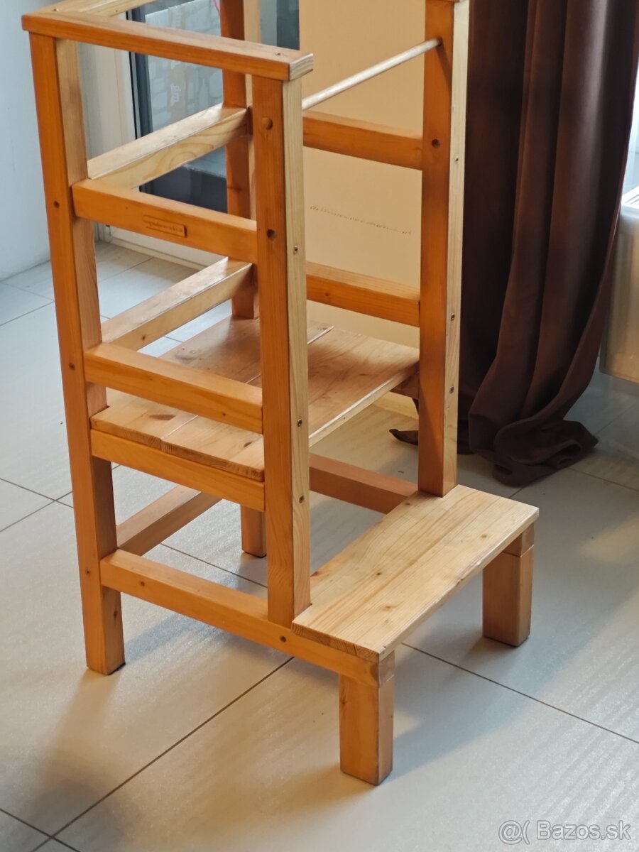Veľký pomocník sú tieto drevene schody. Pomôžu dieťaťu sa dostať tam kde ináč nedočiahne. Dosť to pomáha i pri rozvoji pohyblivosti dieťaťa. Za mňa super. Už ale predávam keďže dieťa vyrástlo. Stav je to proste pomôcka a bola naplno využívaná. Celkove rozmery: 92,5cm výška, šírka 42,5cm, Hĺbka 49,5cm, 1schod je vo výške 21,5cm, 2schod je vo výške 41,5cm. 0911-498727 cena:33€