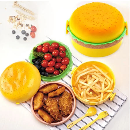 Vtipný box na desiatu alebo obed má tvar hamburgera. Obsahuje tri misky s príborom.