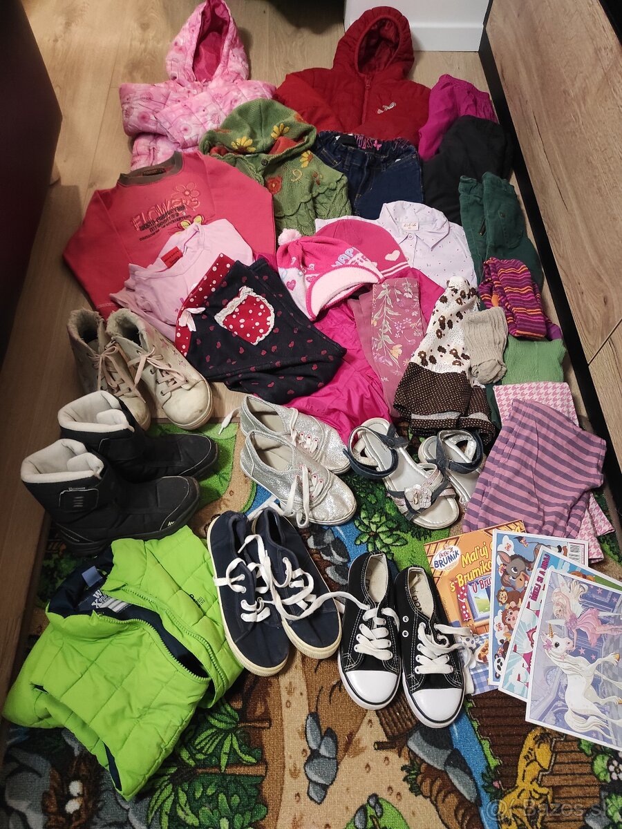 Ponukam balik oblecenia pre dievca velkosti 98, 104, 110 a 110/116. Oblecenie je nosene a je vhodne na doma alebo dvor na donosenie. Ma zmolky alebo vyprane farby, pripadne fliacik. Balik obsahuje aj niekolko kusov pekneho oblecenia vhodneho aj do skolky. Balik obsahuje prechodne bundy, tricko s dlhym rukavom, mikinu, svetrik, suknu, leginy, nohavice a rifle, pancuchy a capice.Sucastou balika je aj obuv na donosenie, sandale, platenky, zimne topanky, velkosti obuvi su 31, 32, 33. Predavam len v celku, nie na dobierku
