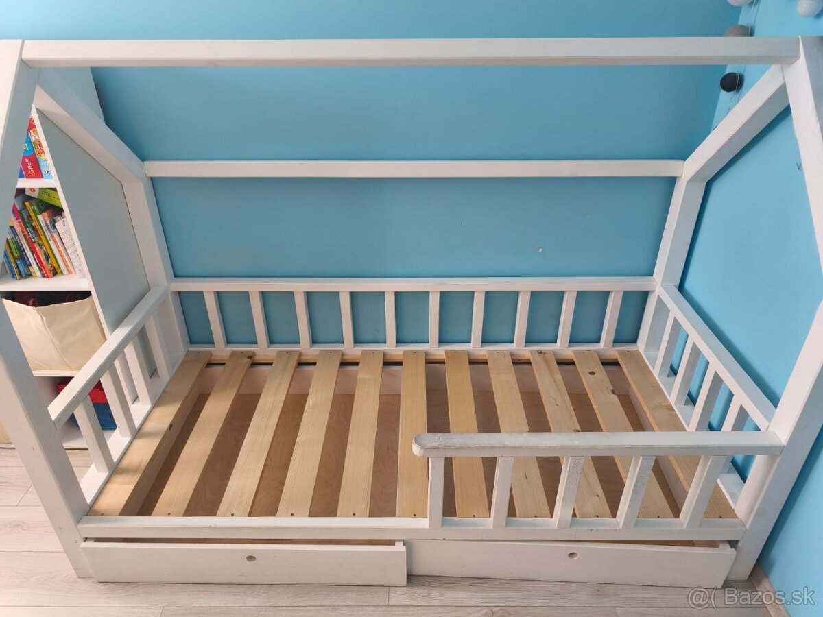 Predám detskú posteľ - domček - v klasickej veľkosti 90x200. Posteľ je rozobratá, má drobné chybičky, ktoré sa ľahko dajú odstrániť malým prebrúsením a natretím farbou. Posteľ je stabilná masívna. K posteli sú dva šuflíky.