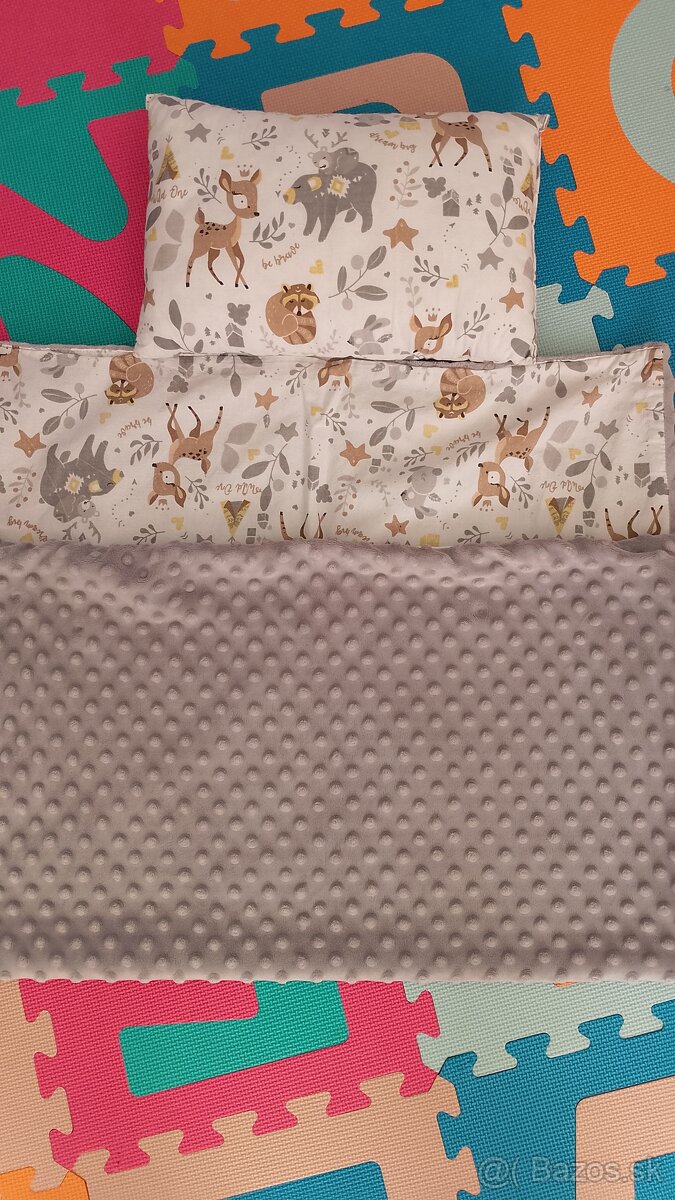 Ako nové, veľmi pekný set s lesnými zvieratkami,z druhej strany teplá minky deka v bledosivej farbe