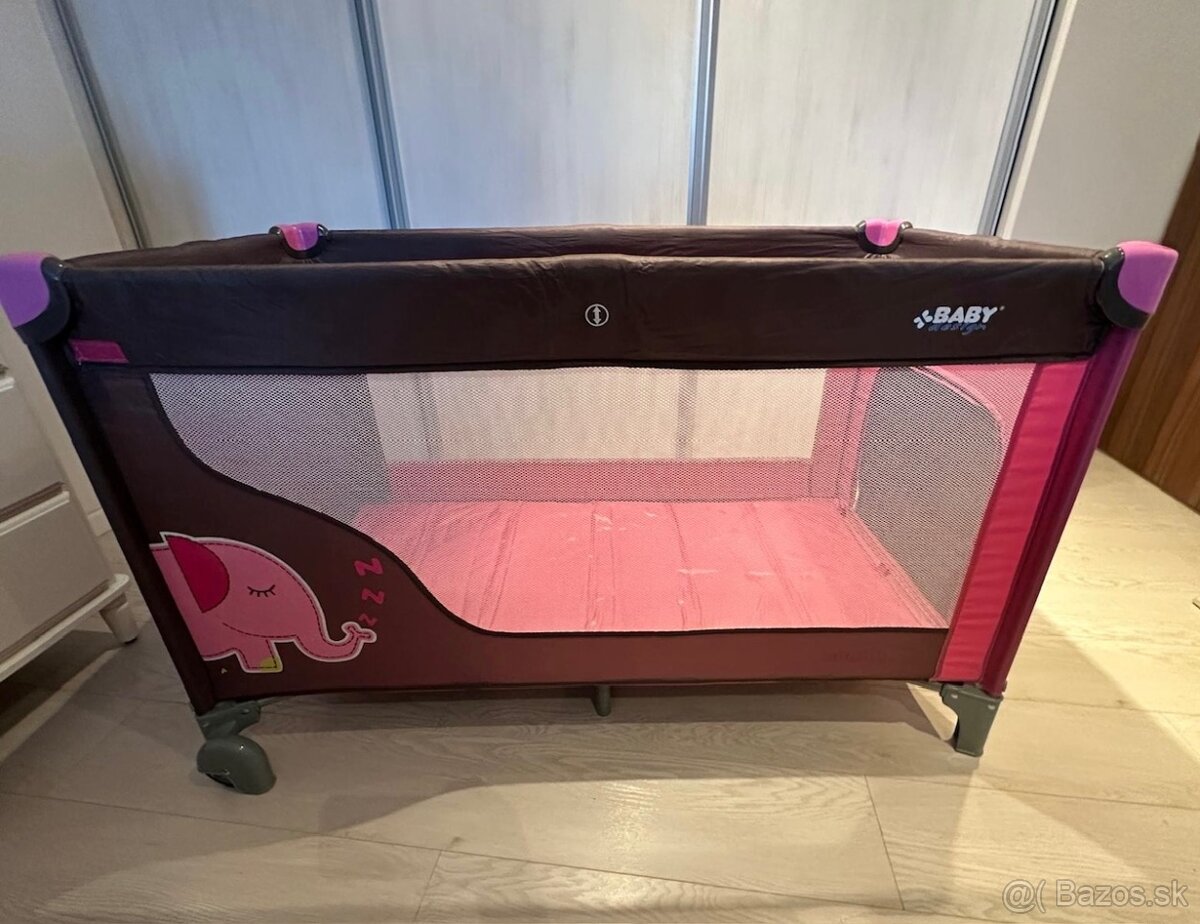 Predám ružovú detskú prenosnú postieľku Baby design. Na jednej strane ma koliečka pre jednoduché posúvanie. Má novorodenecký/prebaľovací odnímací pult. Otvor na zips, aby vačšie dieťa mohlo vyliezť. Darujeme k nej matrac a plachtu. Látka na matraci je kvoli praniu na niektorých miestach poškodená. Postieľka aj matrac používané príležitostne počas návštev u starých rodičov.