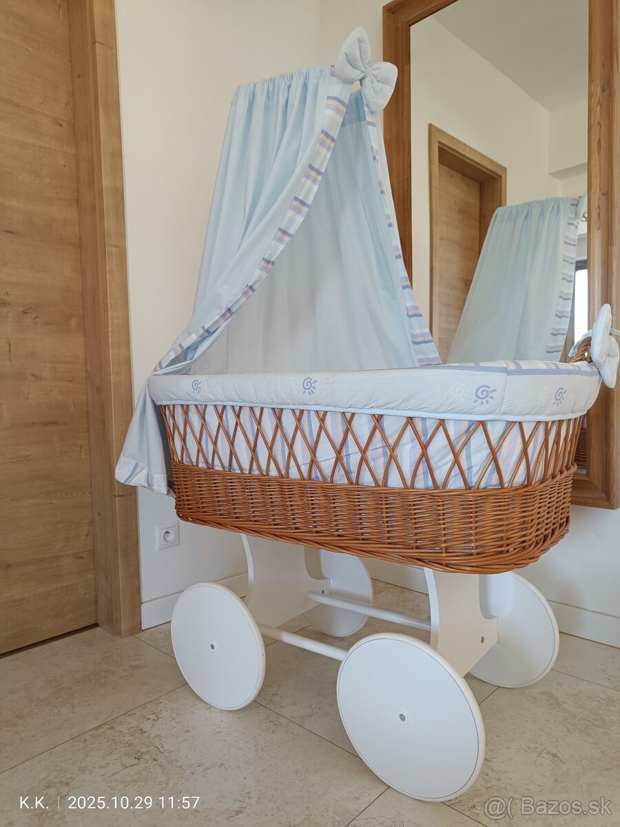 Postieľka - prútený kôš na kolieskach, skvelé sa s ním manipuluje, cena je spolu s celou výbavou, matrac, plachta, paplón, vankúš, mantinel, baldachýn. Bez problémov sa dá nainštalovať do postieľky aj monitor dychu. Top stav. Možný osobný odber Levice, prípadne viem doviesť na trase Levice - Žarnovica.