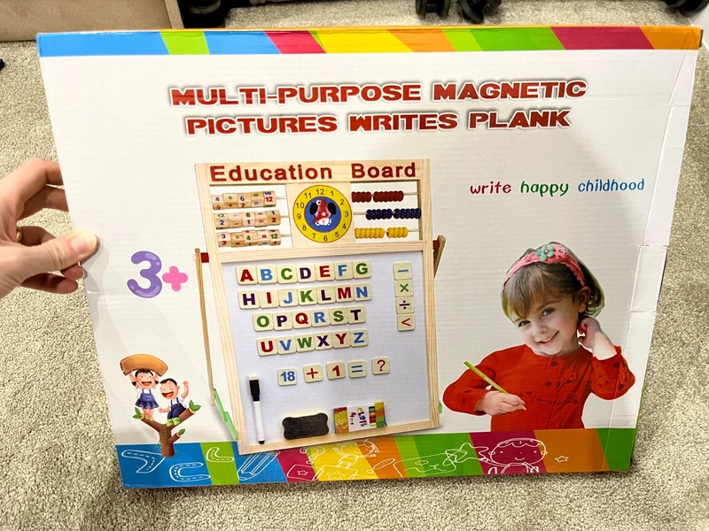 Detská vzdelávacia tabuľka, jedna strana magnetická aj na písanie fixou, druhá strana je tabuľa na písanie kriedami. Čisla a písmenká je nutné vytlačiť z formy, sú magnetické. Nové, ale jednou kriedou bolo na tabuľke písané (chýba z nej asi 1mm)