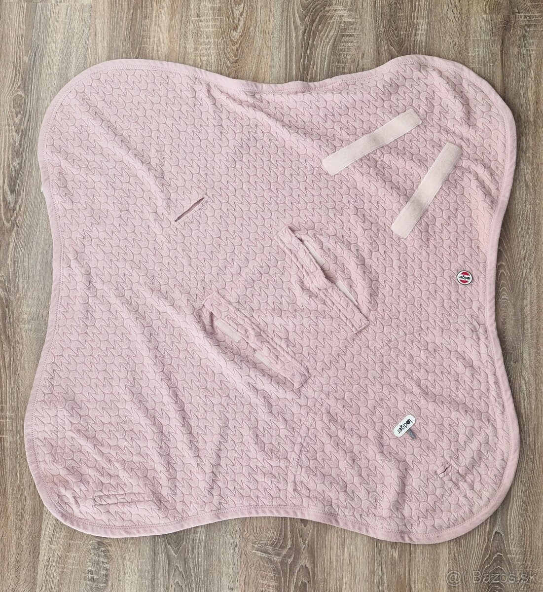 100% polyester, v dobrom stave. Prijemny makky material. Na poslednom obrazku vidiet, ako mozno dietatko do zavinovacky zabalit. Ma 2 otvory na nozicky.