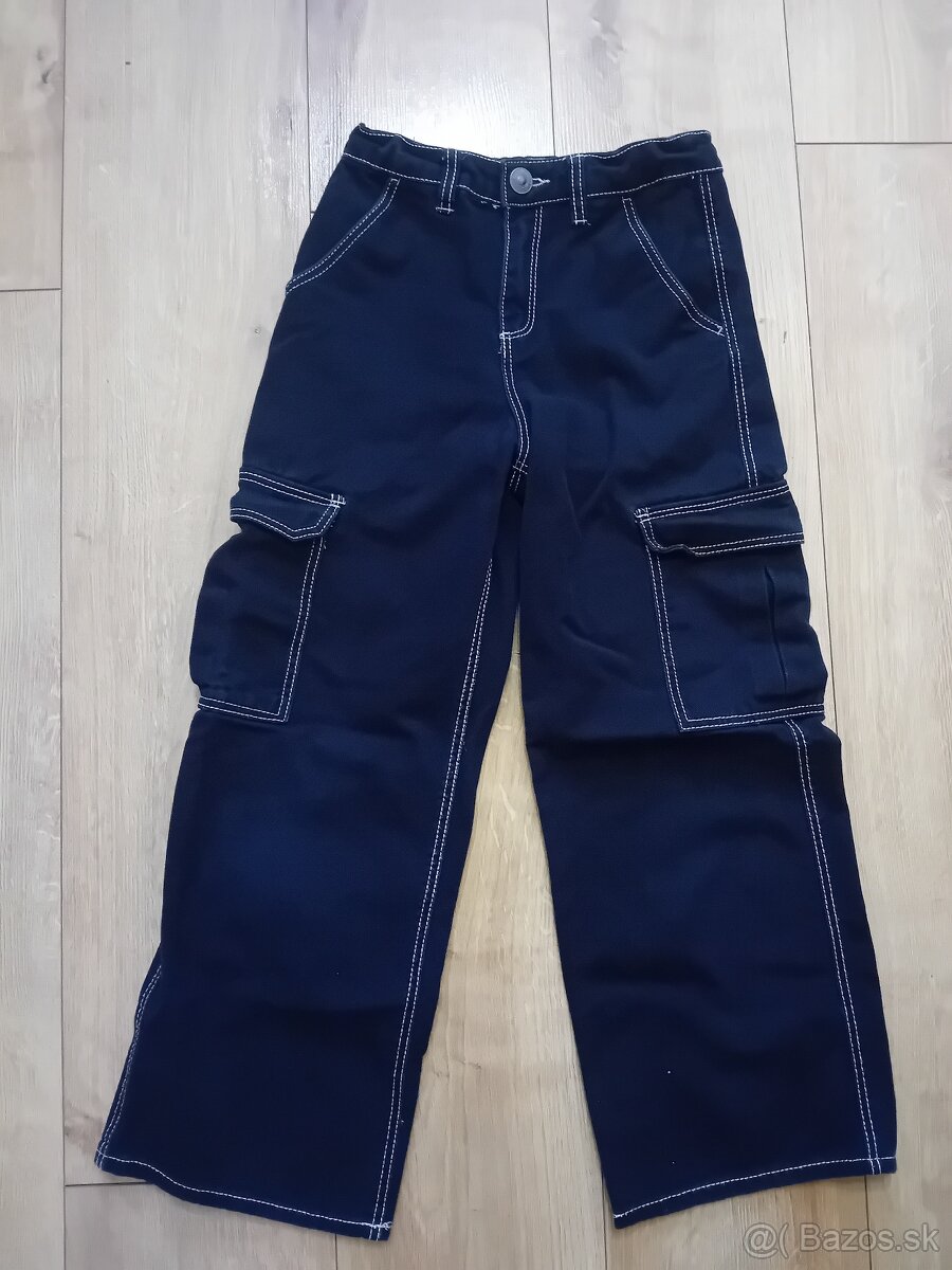 Predám čierne široké rifle vo výbornom stave, v páse sa dajú regulovať. Veľkosť 140, rozmery: celková dĺžka 79,5 cm, dĺžka od rozkroku 56,5 cm, šírka v páse 30 cm.