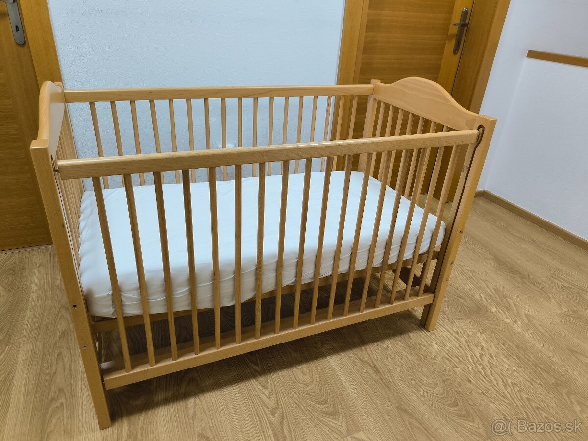 Detská postieľka s matracom - [30.12. 2025]Postieľka je v top stave. Výškovo nastaviteľný rošt. Bok postieľky sa sťahuje na 3 výšky. Pôvodná cena 185€