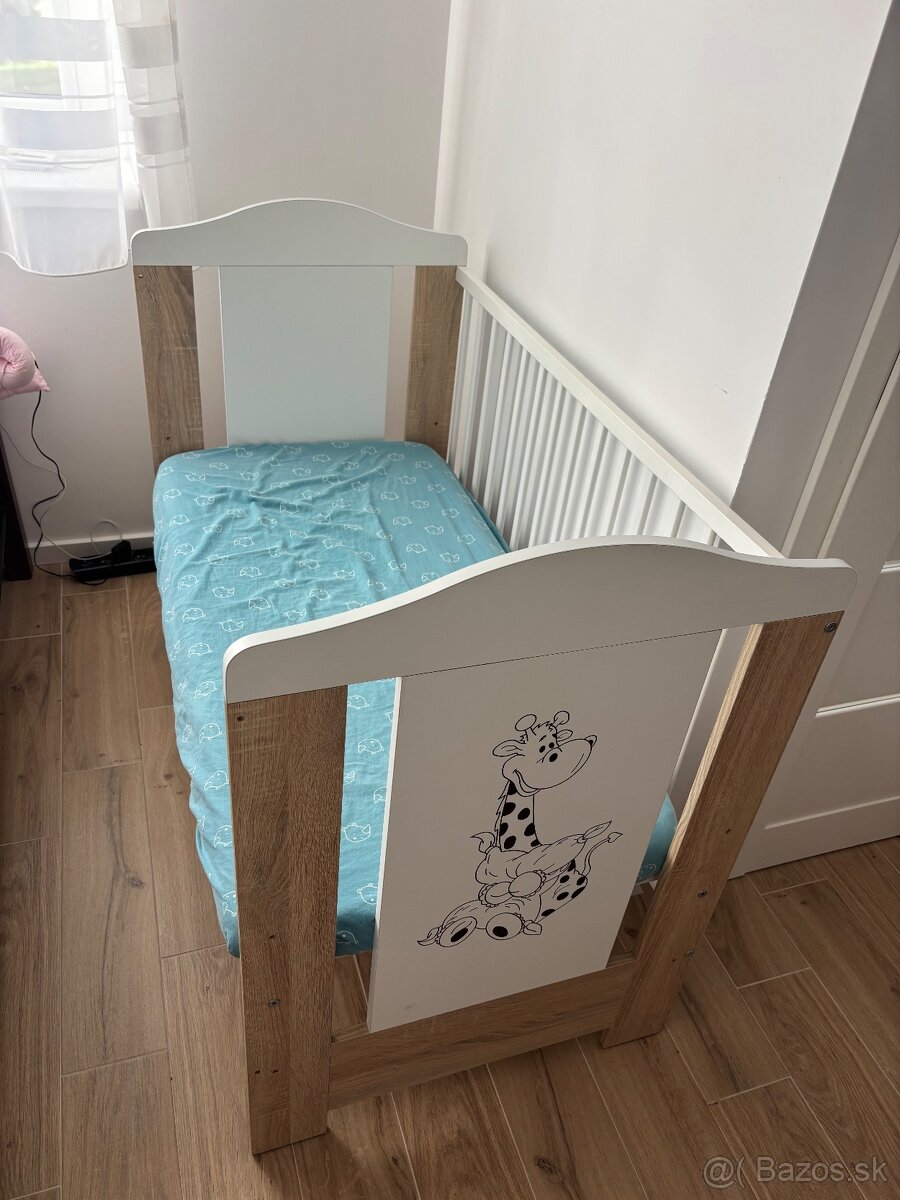 Predám detskú postieľku s madracom 120x60 s regulovaným roštom. Na fotke je demontovaná jedna strana.