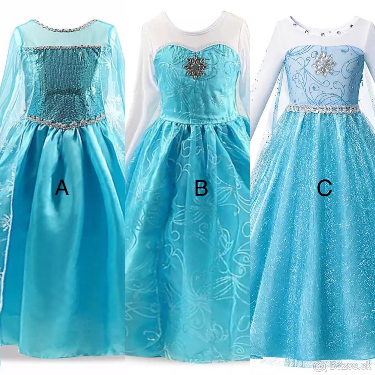 Saténové šaty s tylovou vlečkou a potlačou snehových vločiek, strieborné ozdoby, vpredu zdobené flitrami, rukávy šikmo strihané, zadná časť vrchného dielu elastická bavlna