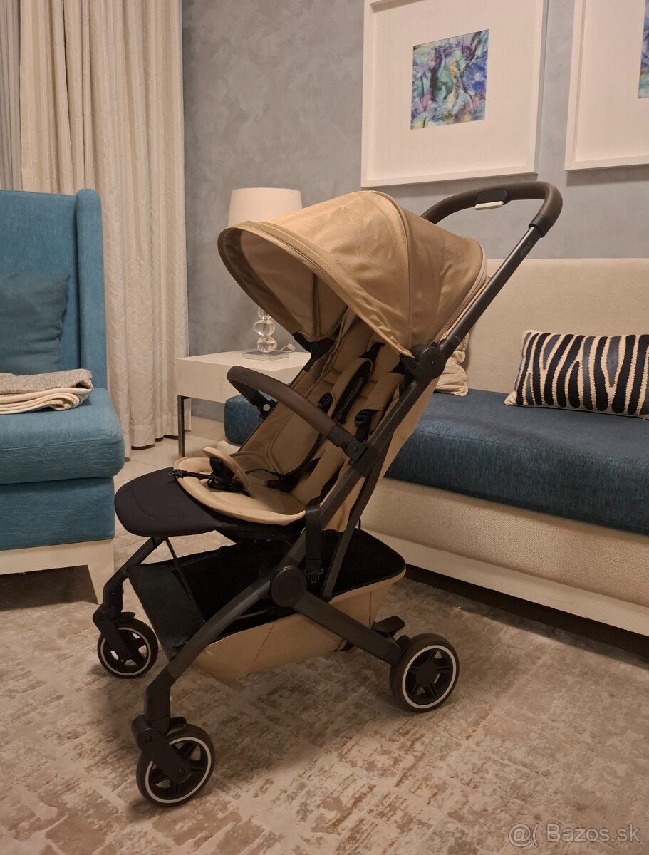 Predám športový kočík Joolz aer plus Lovely taupe, ktorý po zložení spĺňa veľkosť príručnej batožiny do lietadla. Super ľahký (6,5 kg) a super kompaktný. Konštrukcia v poriadku, je vynikajúco odpružená (nový Joolz aer2 má oproti tomuto typu trvdé odpruženie), madlá bez chýb a poťah vypratý a nevyblednutý. Farba lovely taupe je oveľa krajšia ako sandy taupe, je výrazná svetlohnedá, nie taká melirovaná a aj materiál je oveľa príjemnejší na dotyk, nie taký umelý ako pri verzii Joolz aer2. Takisto opierka na nohy je stabilnejšia, lepšie drží polohu ako nová 2ka, kde je opierka súčasťou poťahu.