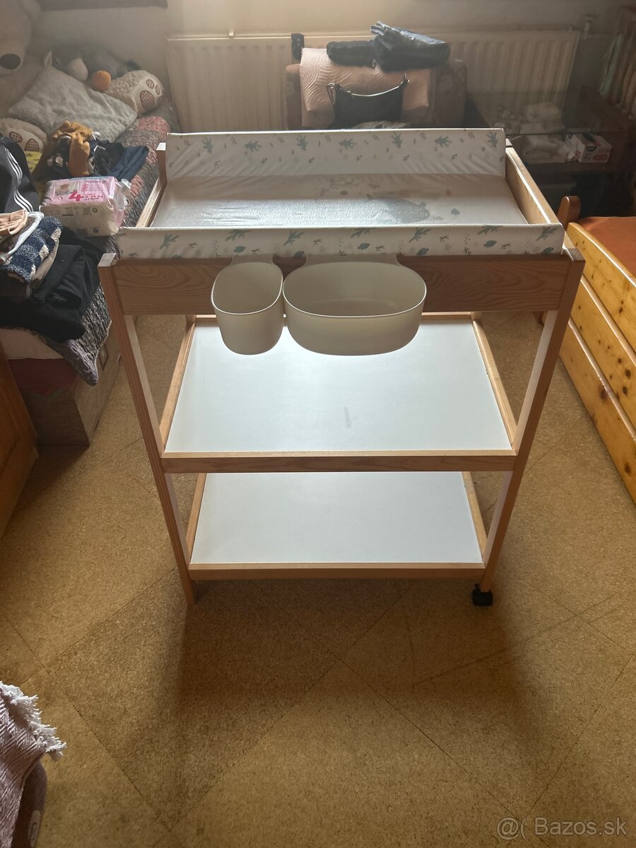 Predám prebytočný prebaľovací pult drevený s dvoma kolieskami na pohodlne presúvanie. Pod pultom sa nachádza ukladaní priestor.