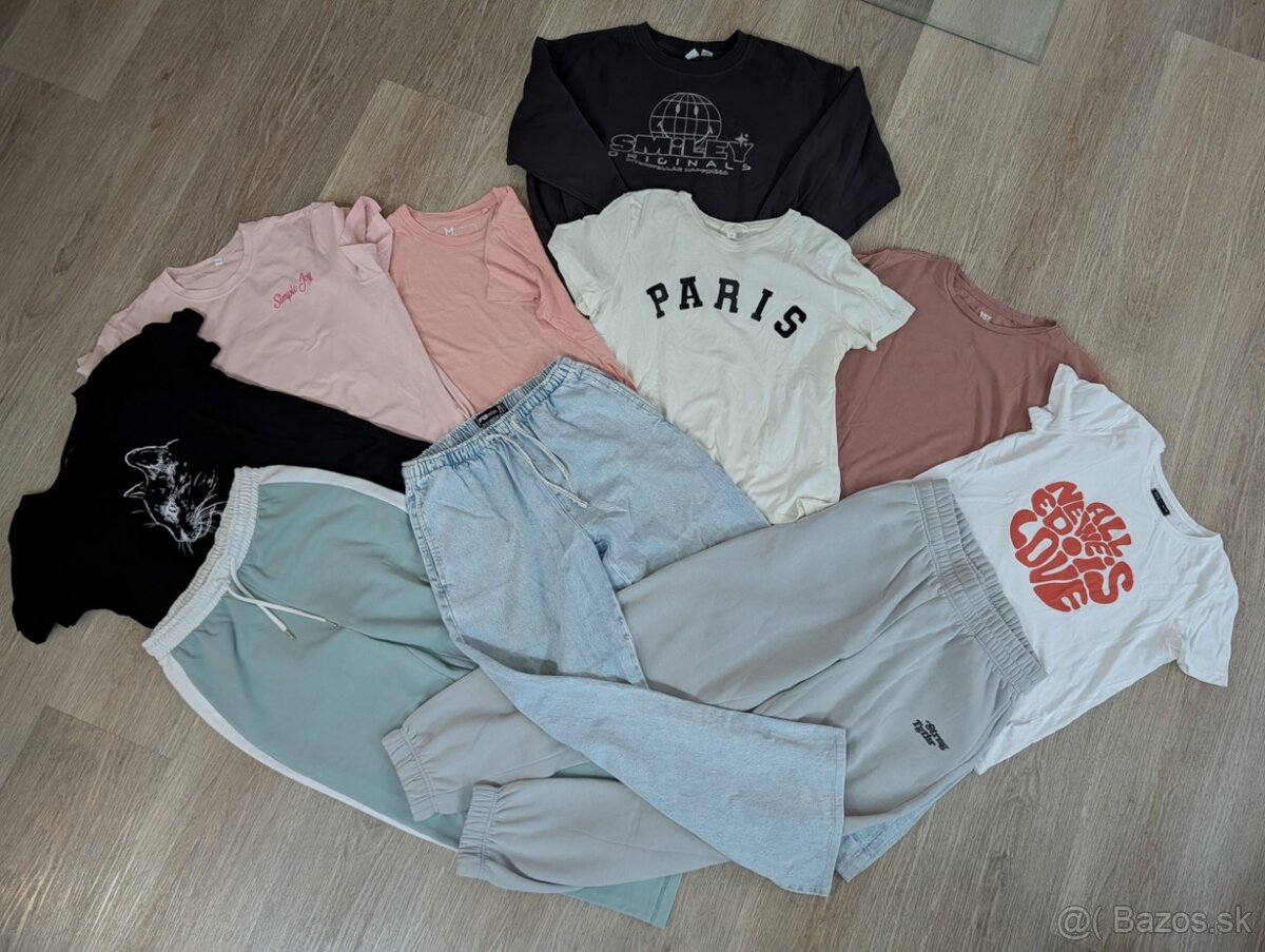 Predám balík oblečenia, veľ. M. Balík obsahuje 1x mikinu (obliekanie cez hlavu), 6x tričko s krátkym rukávom, 1x široké rifle, 1x tepláky s patentom a 1x tenšie tepláky bez patentu. Veci nie sú poškodené, sú bez škvŕn. Cena je za celý balík, bez poštovného.