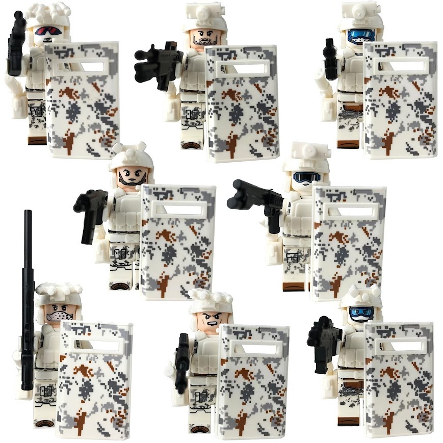 Ponukam sadu SWAT vojakou v pocte 8 ks so zbranami v bielom prevdeni so stitmi. Kazda figurka je zvlast zabalena v zapecatenom sacku. Kompatibilne so stavebnicami lego. Nova sada.