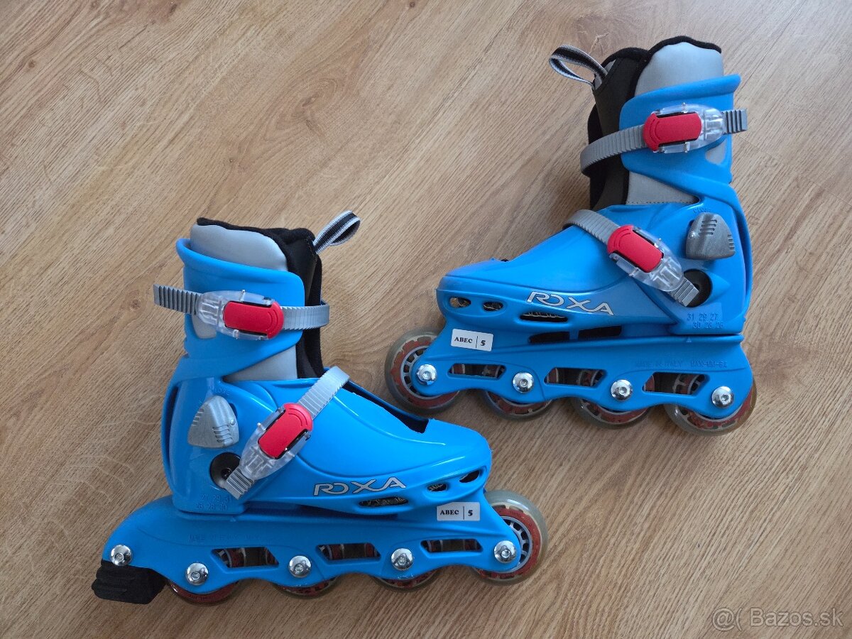 Predám kvalitné detské nastaviteľné kolieskové korčule talianskej značky ROXA. Veľkosť nastavenia 26-31. Korčule sú v top stave,až na maličké odratie(spôsobené učením sa). Pôvodná cena 51€, nová 25€.