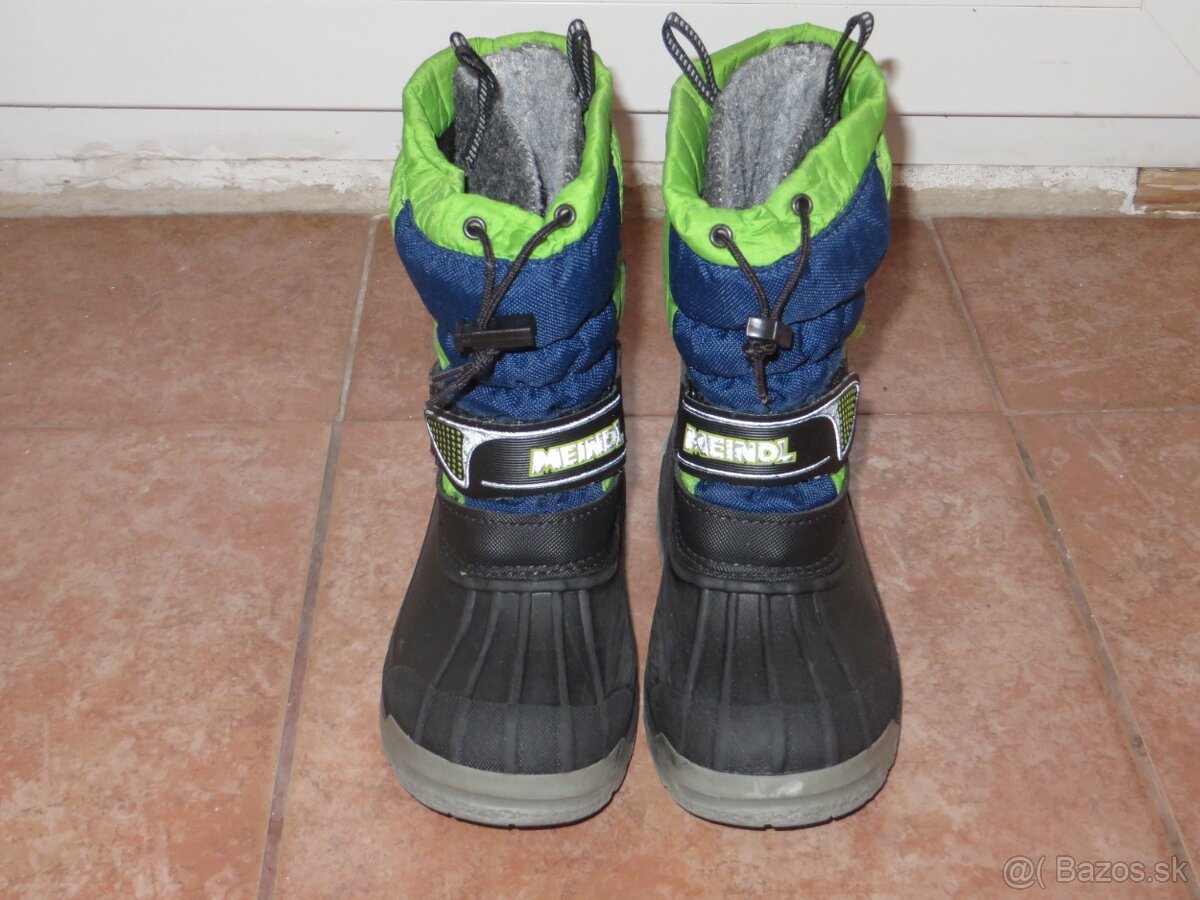 Predám nosené nepremokavé snehule, značky MEINDL, veľ. je 29. Vo vnútri majú vyberateľnú papuču, keď bola noha spotená, papuču sme rýchlo vysušili na radiátore. Vhodné do naozaj riadnej zimy, kopy snehu a na viac hodinové pobyty vonku. Na zadnej časti majú reflexný prvok. Syn ich nosil dve sezóny. Značka MEINDL sa nám osvedčila aj na letných turistických topánkach, ide o kvalitnú značku. Na poslednej foto je vidieť jedno poškodenie, tá zelená látka bola preseknutá (asi lyžou), takže je to zalepené takou opravovacou látkou. Cena je tomu prispôsobená, pretože PC bola o dosť vyššia. Cena je 27€ a nezahŕňa poštovné a balné, ktoré je podľa taríf Slovenskej pošty. Tovar posielam po prevode na účet.