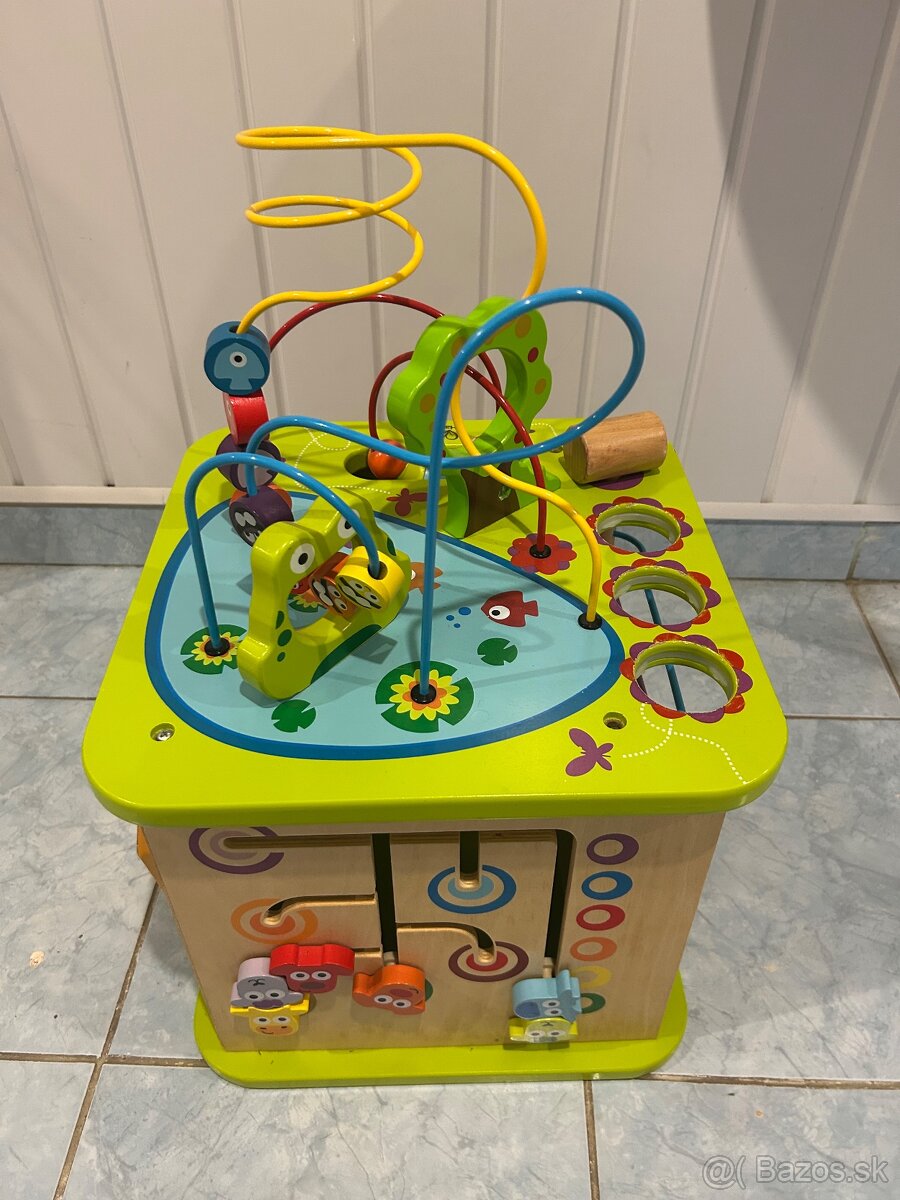 Táto hracia kocka Little Animals od spoločnosti Hape je vybavená triediacou hrou, guličkovou dráhou, otočným stolom a bludiskom, ktoré sú doplnené farebným, jedinečným plávajúcim drôteným bludiskom. Všetky priateľské postavičky a zvieratká sú maľované veľkými očami, ktoré poskytnú veľa zábavy deťom aj dospelým.