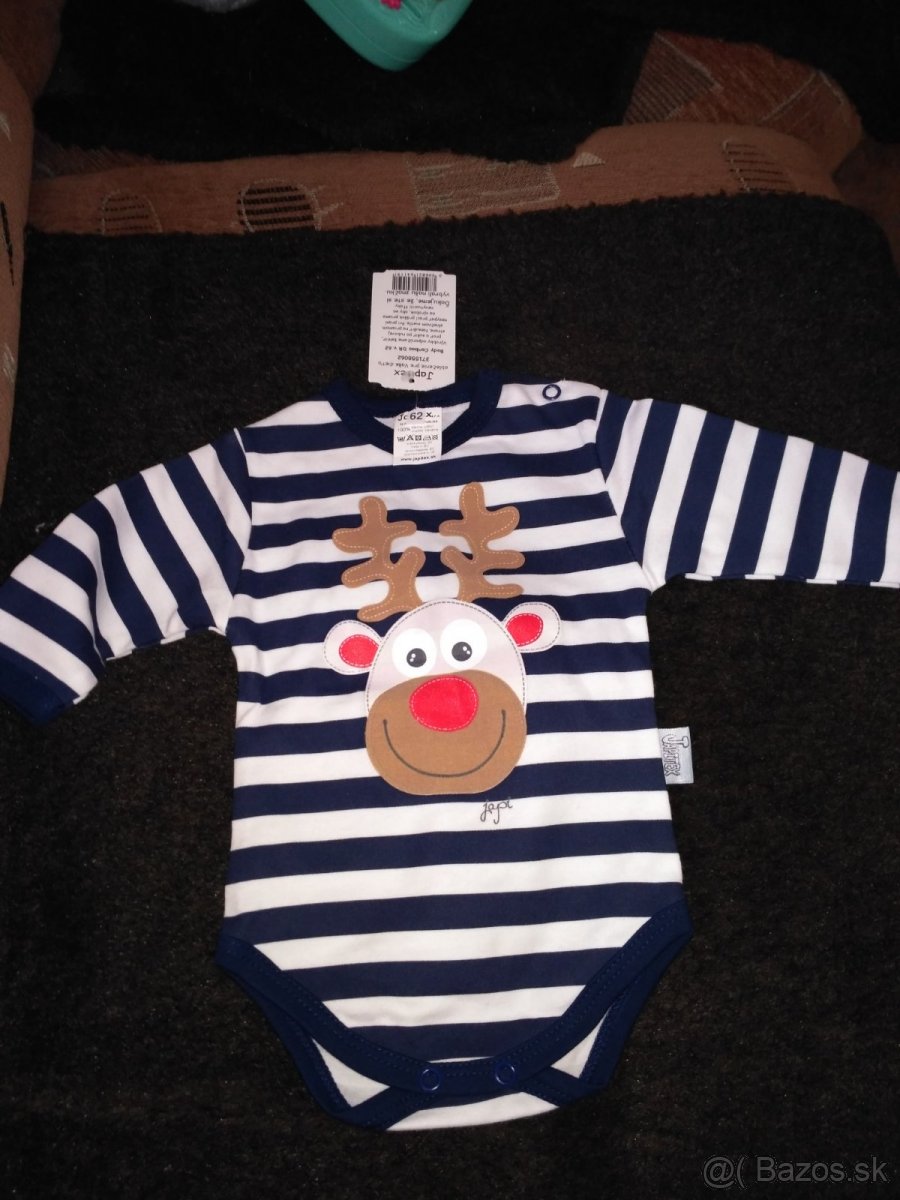 Vianočné body, čiapka a podbradník, veľkosť 62 - [26.1. 2026]Body veľkosť 62 s čiapkou a podbradníkom, ideálne na vianočné fotenie. Použité len raz a to na fotenie. Perfektný stav.