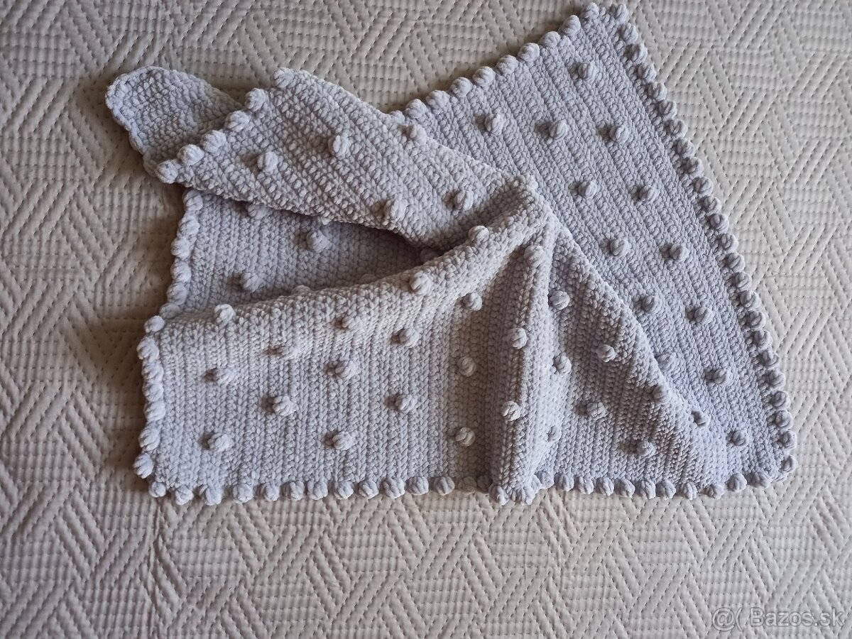 Predam hackovanu deku do kocika alebo postielky v peknej sivej farbe s nopovym vzorom. Vyrobena z dolphin baby vzdusnej a pritom hrejivej vlny. Vhodnej pre babatka. Rozmer 60x80cm. Nova. Cena 35eur.