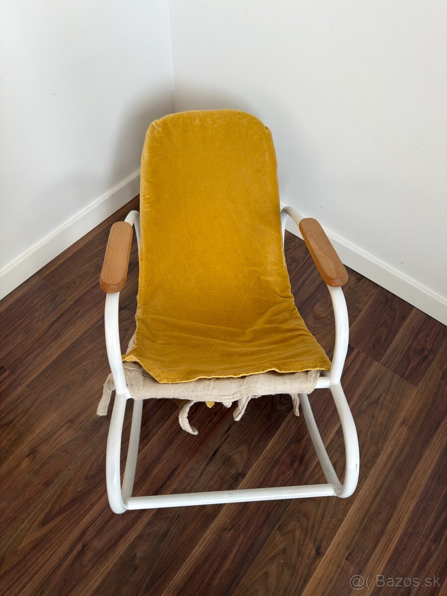 Kompletne zrepasovana "komunisticka" detska hojda/hojdacka. Biela konstrukcia, gumena biela paska v spodnej casti kvoli ochrane podlahy, nanovo vyrobene dubove zabrany proti prevrhnutiu, dubove madla vybrusene a navoskovane neskodnym voskom, nanovo zosite polstrovanie - spodne z hrubeho lanu, horne z jemenj zltej hrubej latky. Pratelne.