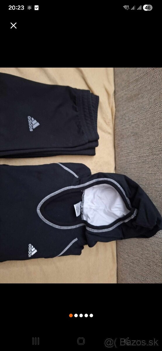 Predám teplákovú súpravu značky ADIDAS čiernej farby. Bunda je s kapucňou a vreckami rozmery-šírka 40cm,,dĺžka 55cm,rukáv od krku 60cm, Nohavice- dĺžka 88cm, od rozkroku 63cm,pás 32 cm