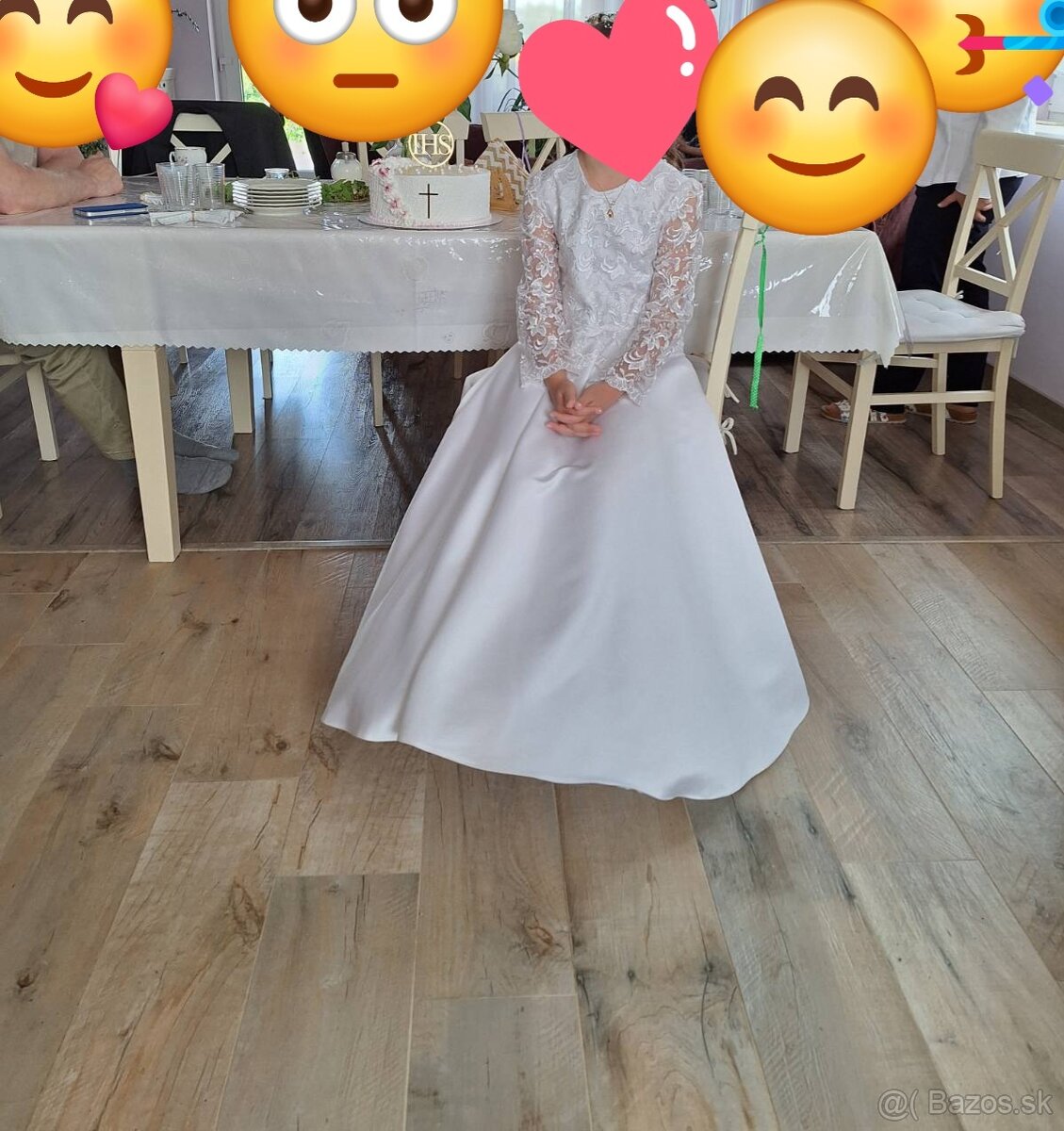 Šaty na 1.sv.prijimanie, biele, velkost 140, prip.134. Vrchny diel cipka, kruhova spodnicka. Zapinanie vzadu.