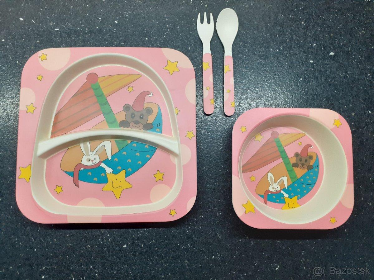Predám detskú sadu riadu z bambusu. Riad je vyrobený z bambusového vlákna, čo znamená že je veľmi šetrné k prírode, biologicky rozložiteľné a ekologicky nezávadné.