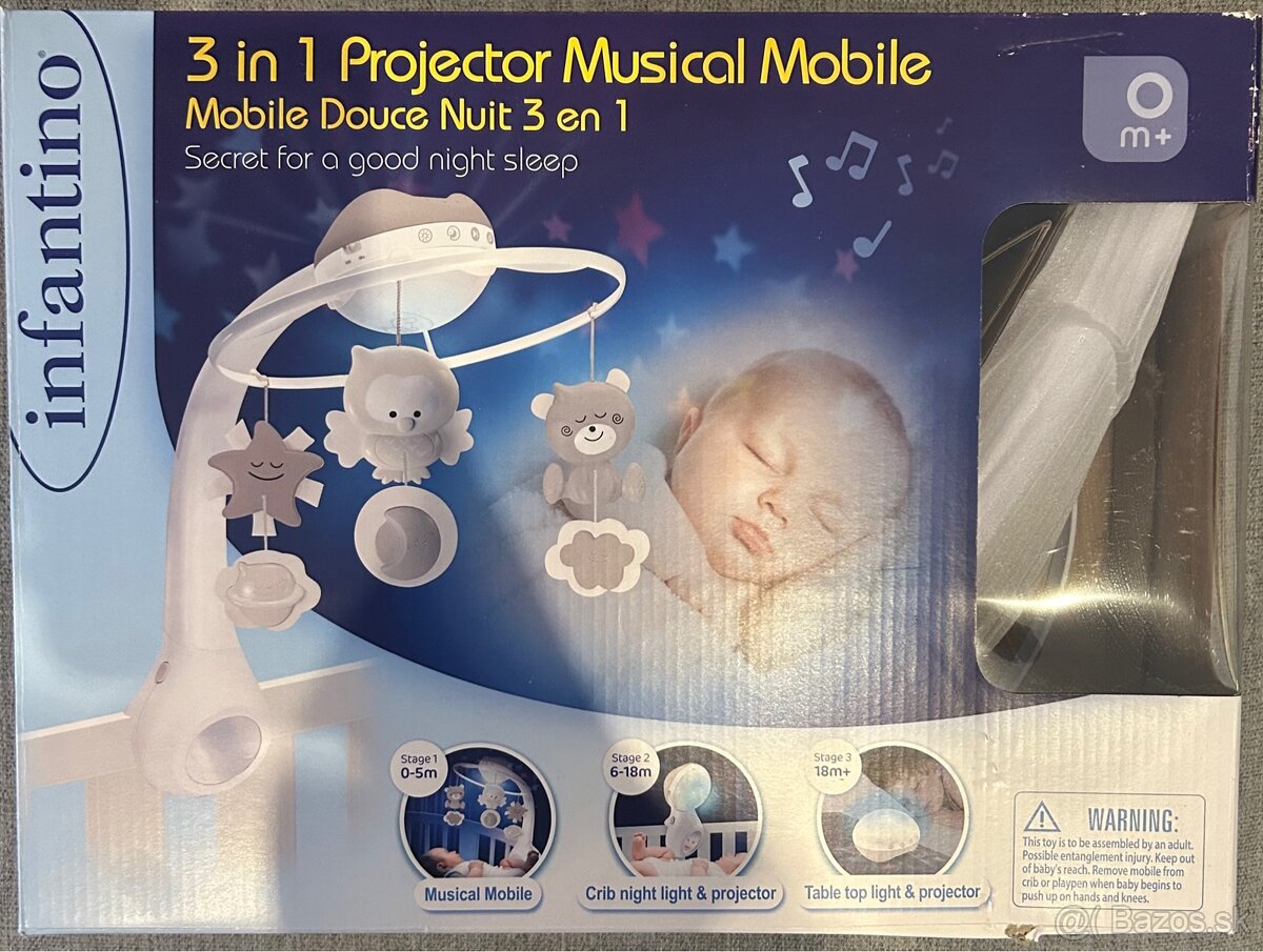 Infantino 3v1 Projector Musical Mobile možno použiť 3 spôsobmi, nad postieľku ako hudobný kolotoč alebo hviezdny projektor, prípadne ako nočnú lampu.