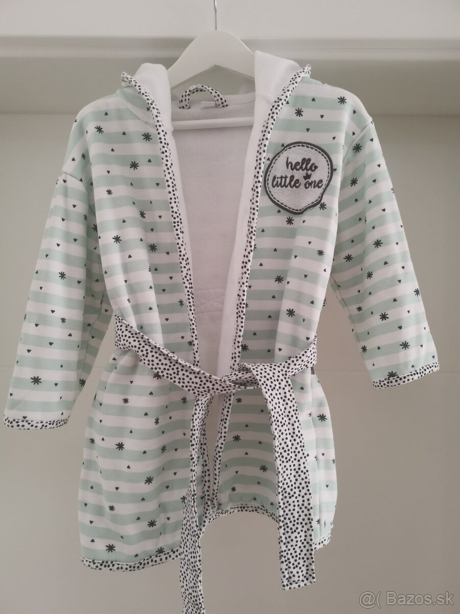 Predám detský župan vhodný po kúpaní veľ.86/92 zn. bébéjou.Je pre deti cca od 1,5 do 3,5 roka. Syn má 3,5 a je mu dobrý. Rukáviky sa dajú vyhrnúť alebo nie.Bol párkrát použitý. Osobný odber Nitra alebo cena+pošta.