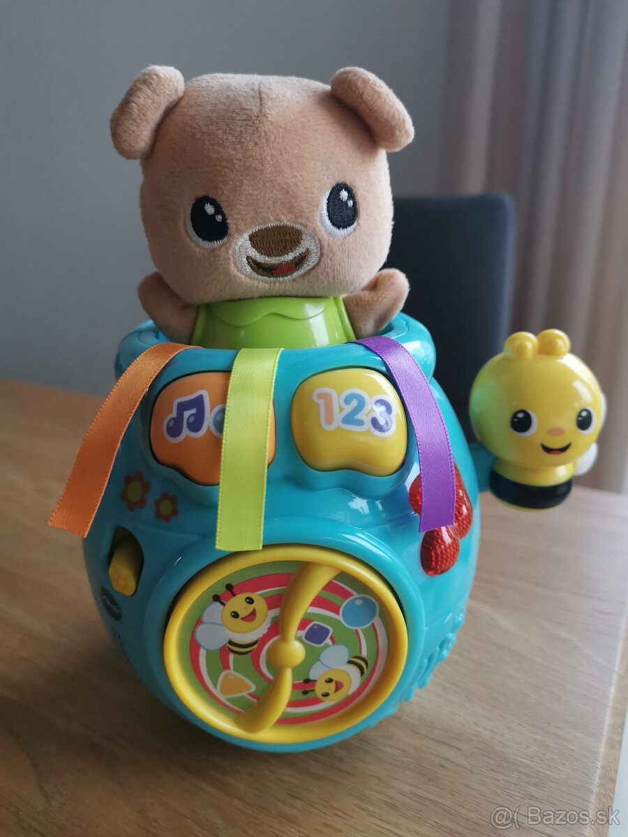 Vtech Medvedík je hudobná hračka pre deti už od 6 mesiacov. Roztomilými frázami interaktívne komunikuje s dieťaťom. Ľahkým zatlačením medvedíka do hrnca so medvedík schová. Následným stlačením tlačidla potom medvedík „vyskočí“ z hrnca von. Všetko je sprevádzané zábavnými frázami, piesňami a melódiami. Na baterky. Bezchybný stav. Osobný odber Nitra alebo cena+pošta.