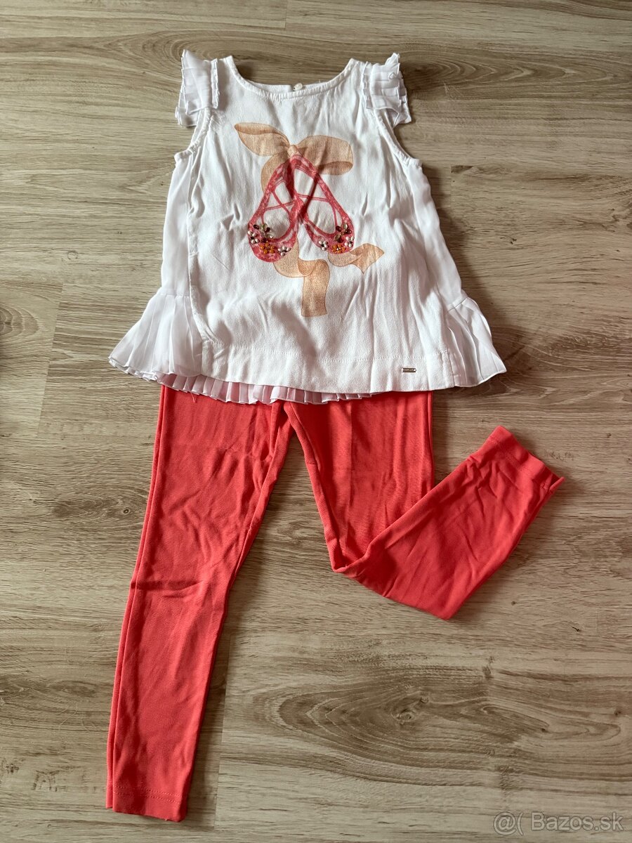 Predám súpravu mayoral po dcérke vo veľkosti 122. Suprava sa skladá sú trička a nohavíc. Nohavice sú na stahovaciu gumičku viete si ich dopasovať podľa postavy dievcatka. Tricko má zapínanie na chrbte na gombicek. Cena 15,-€