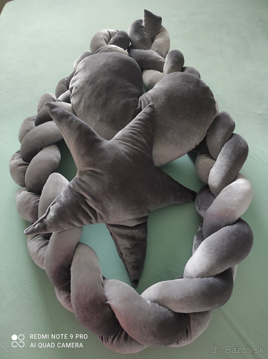 Predám mantinel do detskej postieľky,farba je šedá,takže vhodné,aj pre chlapca,aj pre dievča. Vankúše v tvare srdiečka a hviezdy..Všetko je v super stave.