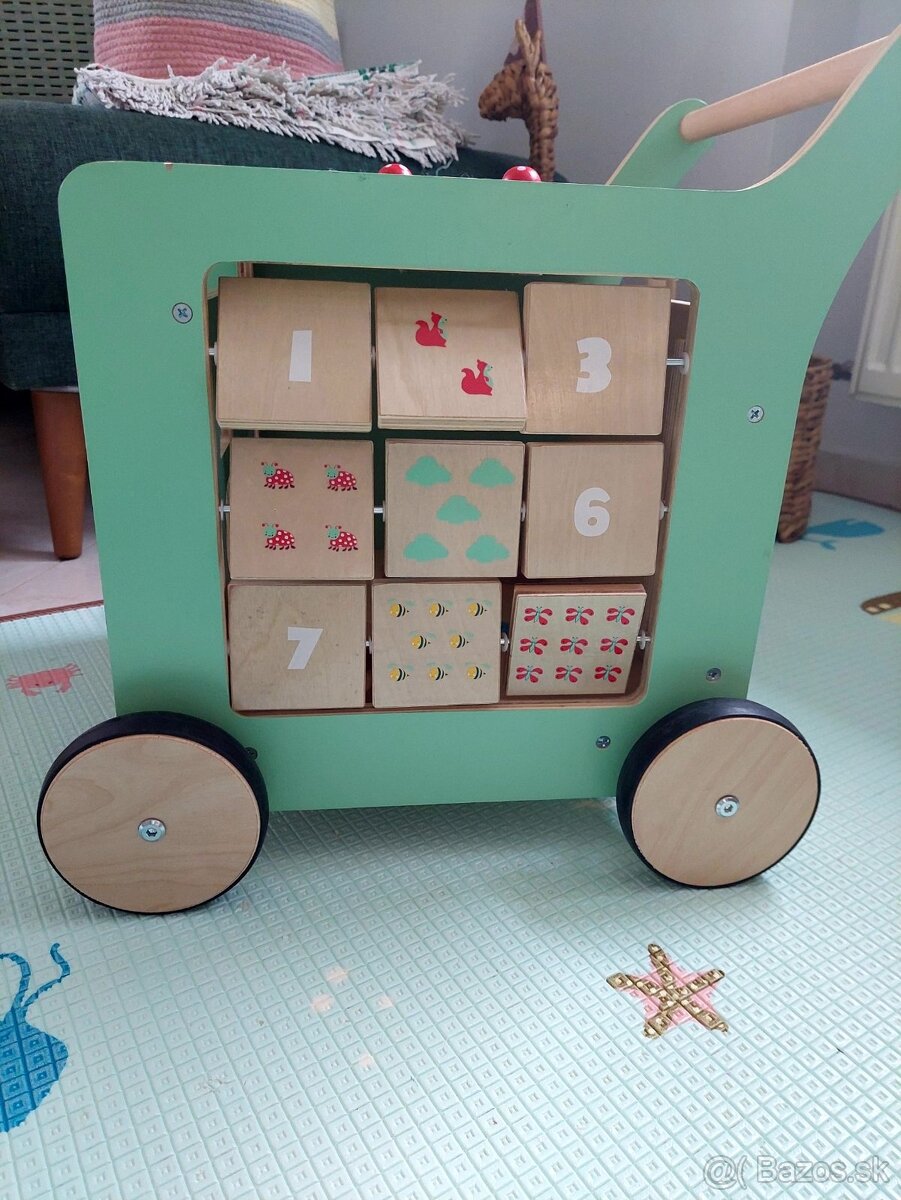 Veľká motorická kocka umožňuje precvičovanie si motorických schopností a naviac má vo vnútri praktický box na odkladanie hračiek. Drevené kolieska sú potiahnuté gumou, čo zaisťuje stabilnú jazdu na hladkej podlahe. Pre bezpečnosť dieťaťa chodítko obsahuje brzdu.