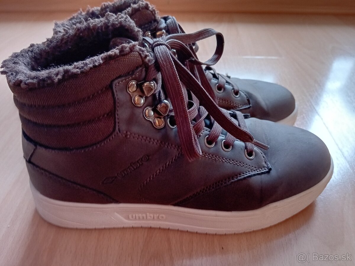 Predám chlapčenské zimné topánky tmavohnedé, veľkosť 36, vnútorná dĺžka 24 cm, značka Umbro.