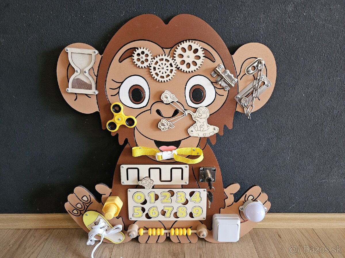 Predám aktivity board drevenu manipulacnu dosku Opicku 60 x 55 cm, vyrobené z ľahkej drevenej preglejky, možne menit farbu zvieratiek a komponentov podľa požiadavky.