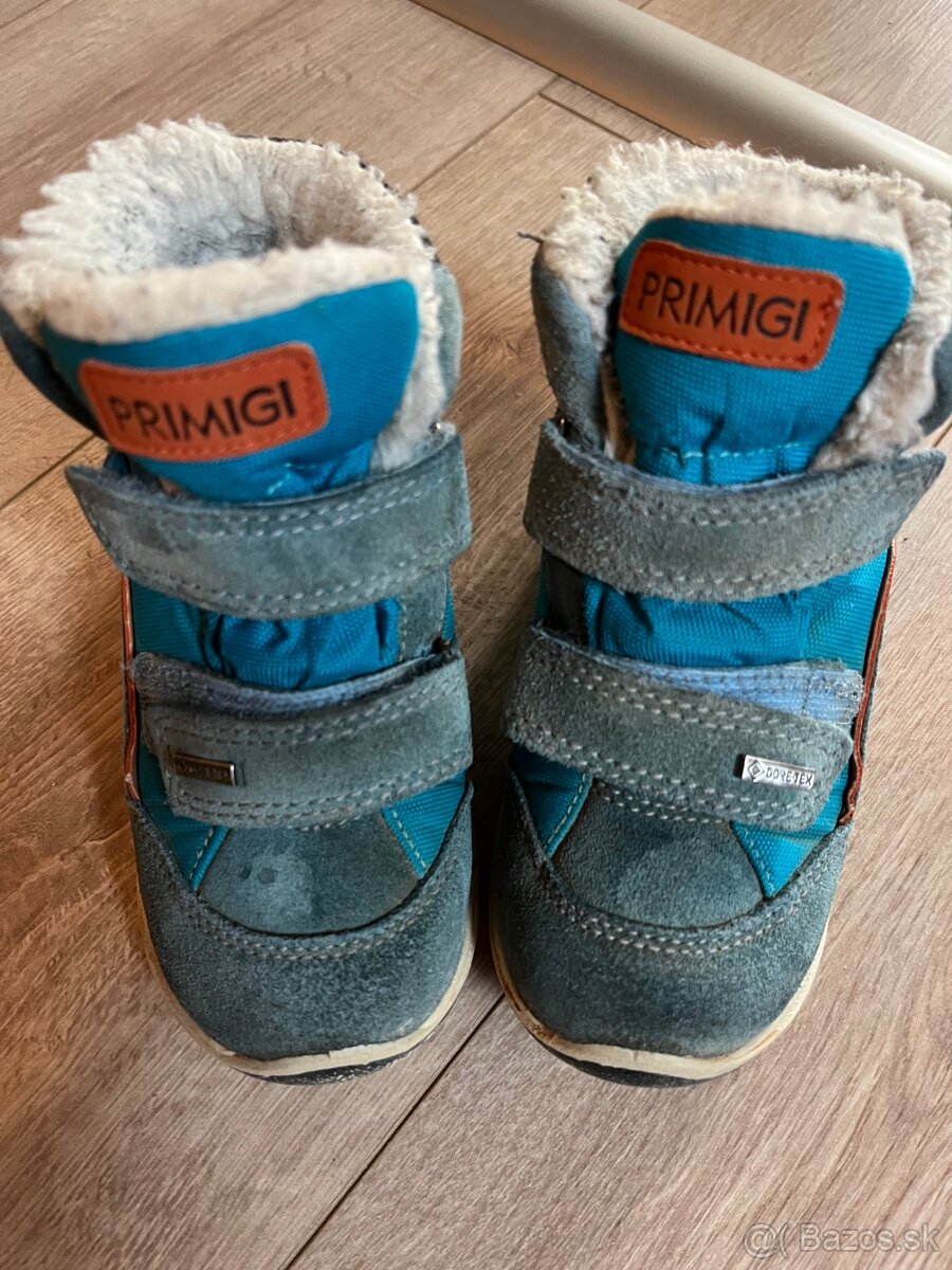 Predám chlapčenské zimné topánky primigi, veľkosť 26, VD nameraná 16,5 cm, nepremokavá membrána GoreTex, zvršok kombinácia kože a syntetiky, vnútro aj vložky zateplené s dlhším textilným vlasom, vložky zo spodnej časti teflónové /zabezpečuje to väčšiu výhrevnosť/. Obuv je vhodná na široké a stredne široké chodidlá, chodidlá plutvičkového tvaru a s vysokým priehlavkom /nartom/.