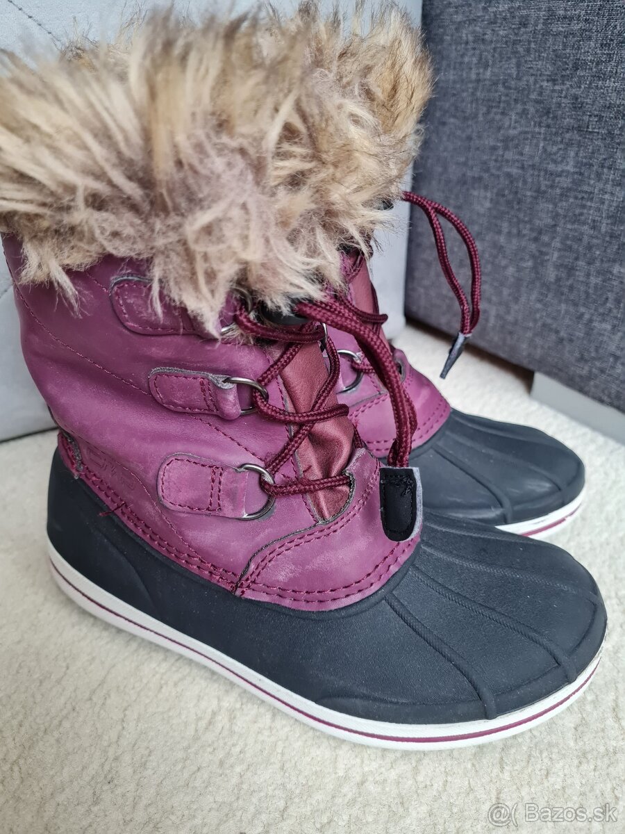Predám používané snehule pre dievčatko vo veľkosti 32. Znacka CMP. Zateplene nepremokavé. Spodná čierna časť je z gumy a bordová časť je koža.