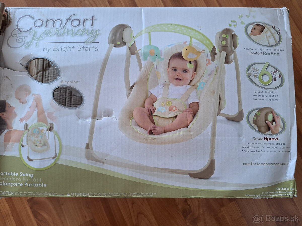 Predám prenosne hojdacie kreslo/lehátko Comfort&Harmony od zn. Bright Starts v neutrálnej béžovej farbe vhodnej pre chlapca i dievča. Hojdačka je vhodná pre deti s hmotnosťou do 9 kg a zabezpečuje pohodlné hojdanie kdekoľvek a kedykoľvek. Technológia True Speed umožňuje prispôsobiť rýchlosť hojdania ako dieťa rastie, pohodlné sedadlo je možné sklopiť do 2 pozícií. Hojdačka ponúka 6 originálnych melódií s ovládaním hlasitosti a utomatickým vypnutím, sklopnú hrazdičku s 2 hračkami, plyšové sedadlo s odnímateľnou opierkou hlavy. Časovač hojdania možno nastaviť na 15, 30 alebo 45 minút. Výhodou je aj tichý chod, jednoduché zloženie a spratné skladovanie, 5 bodové popruhy, protisklzové nožičky. Podušku sedátka a hlavovú opierku možno jednoducho oprať v práčke. Hojdačka je plne funkčná, vo výbornom stave bez akýchkoľvek poškodení a navyše v pôvodnom balení aj s krabicou.