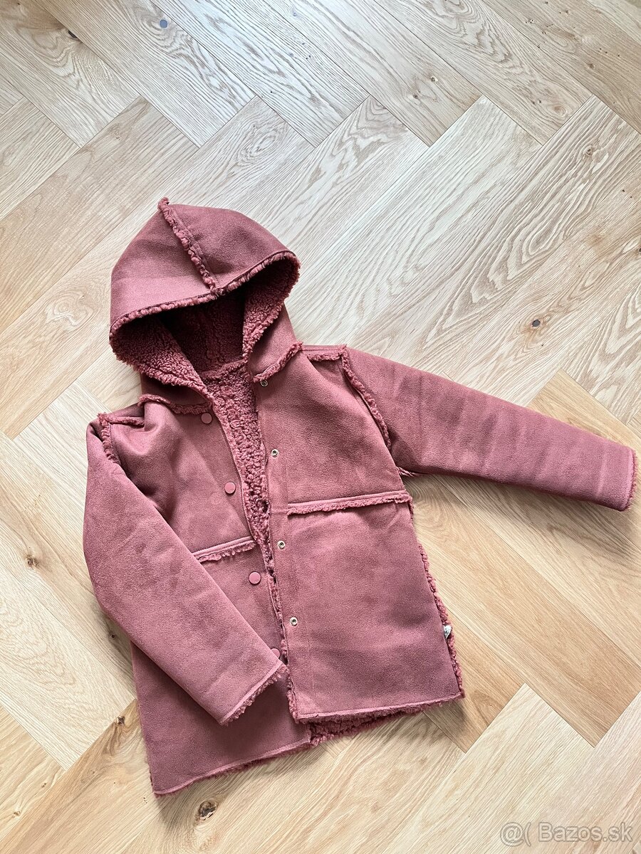 Kabátik z jednej strany pôsobí ako brúsená koža (suede look) a z druhej strany je mäkučký, hrejivý teddy (nie je však obojstranný).