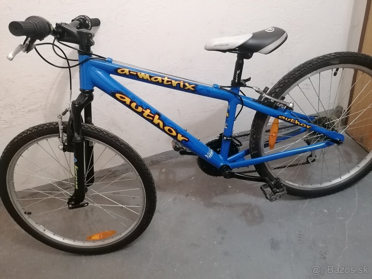 Predám detsky horský bicykel AUTHOR Matrix veľkosť kolies 24 odpružena predná vydlica hliníkový rám prehadzovacky shimano 3x6 speed riadenie grip shift. Vhodný od 7 rokov Bicykel je premazany nastavený s novými gumani a gripmi pripravený na sezónu cena 80 eur Dubnica nad Váhom