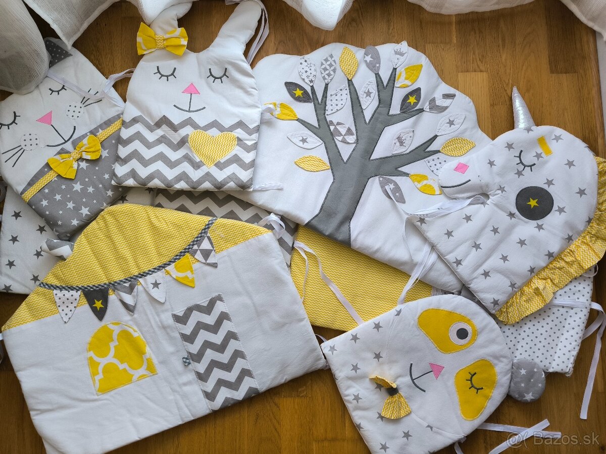 Predám krásny detský modulový mantinel v jemnom šedo-žltom prevedení so zvieracím motívom. Vhodný pre chlapca aj dievča. Mantinel je vo veľmi dobrom stave, bez poškodení, starostlivo udržiavaný. Skladá sa zo šiestich mäkkých vankúšikov, ktoré si môžete ľubovoľne kombinovať podľa potreby postieľky a jedného extra dlhého mantinelu. Čiže vyjde okolo celej postieľky. Každý modul má šnúrky na jednoduché a bezpečné upevnenie na priečku postieľky.