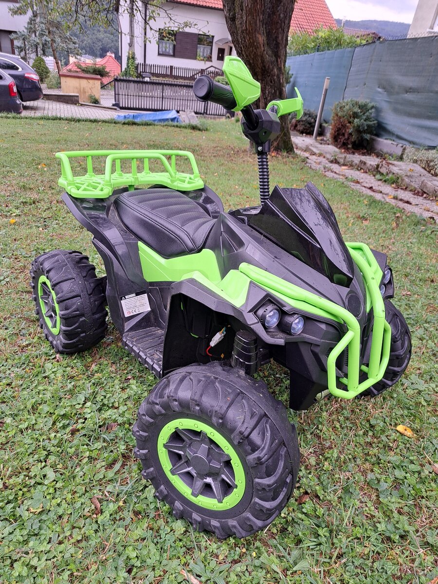 Predám elektrickú štvorkolku 4x4 Predný a zadný náhon po prepnutí tlačítka.spiatočka, Svetlá, odpružená, rádio na USB, 3 rýchlosti, nabíjačka, diaľkový ovládač ktorý je nadradený .
