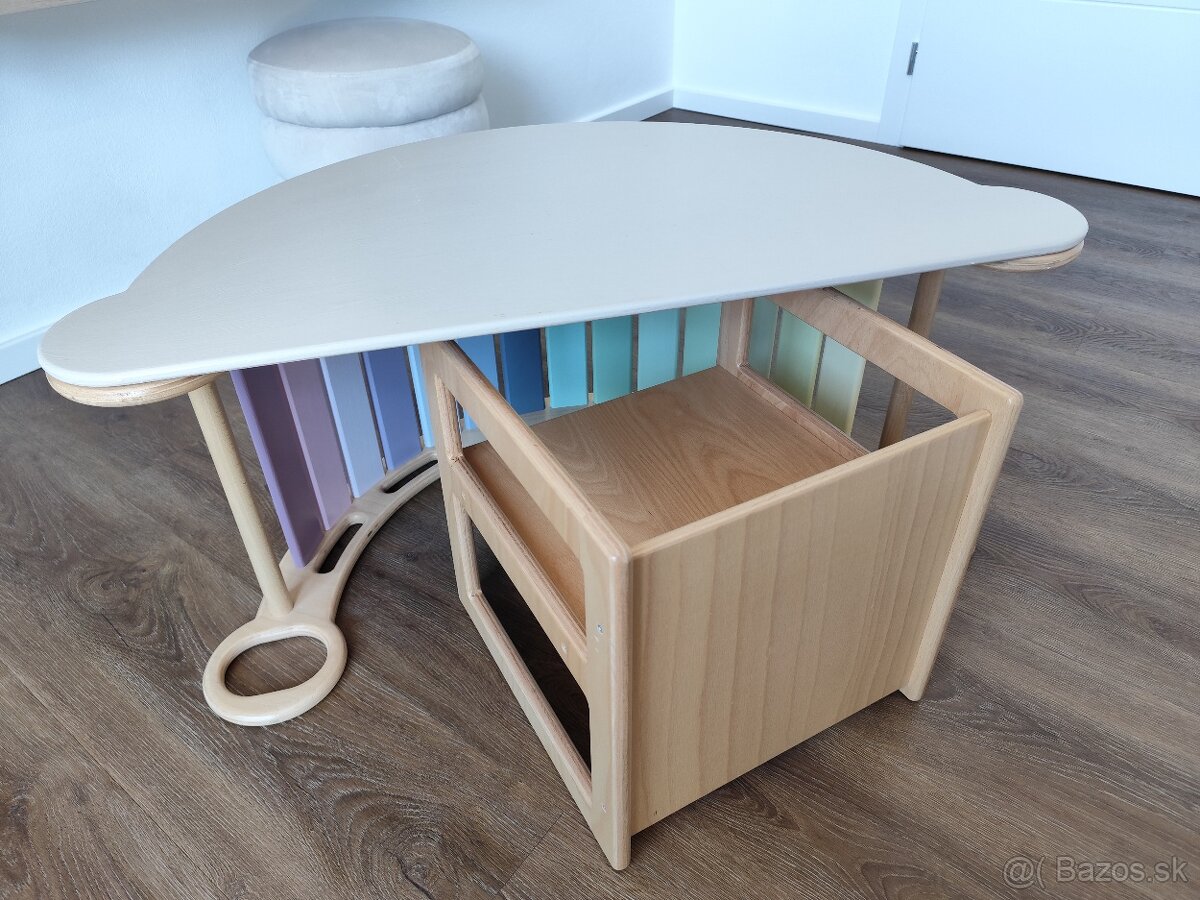 - Stolík: Vďaka špeciálnej stolovej doske a stoličke vytvoríte stabilné miesto na kreslenie alebo desiatu. Stolová doska bola prelakovaná. Ak by vám odtieň nevyhovoval, povrch sa dá jednoducho prebrúsiť na pôvodné drevo alebo znova pretrieť podľa vášho vkusu