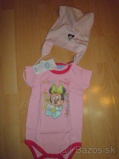 Nádherné bodynko s Minnie,nové s visačkou, Disney Baby. Čiapočka s Minnie len praná, nenosená, veľkosť písaná 104, ale rozhodne omnoho menšia, tak 86-92, veľmi zaujímavá, pekne ukáže na hlávke, šmolková, ale uväzovacia. cena 7,50e