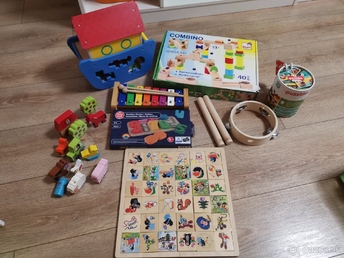 Predam velky balik drevenych hraciek do 3 rokov. Je tam drevena gulockova draha, malo hrana, ako nova. Vkladacky, hudobne nastroje. Drevene zvieratka, drevena hra-Krtko(trosku popisana na spodnej strane vid foto) a pexeso od 2.rokov(tvrde kartonove).Osobny odber Ba-Petrzalka.