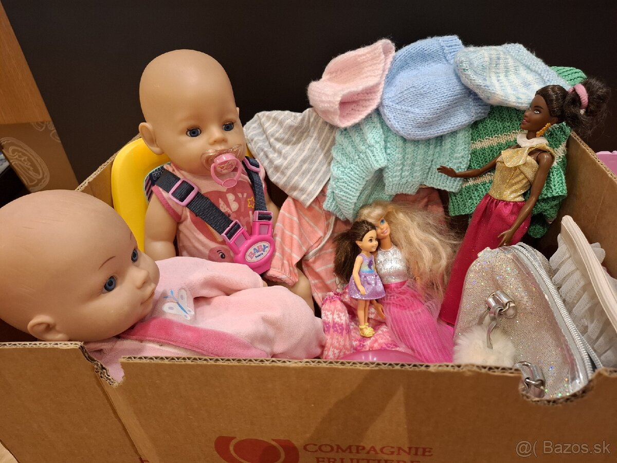V krabici je Baby Born Annabell - s cumlíkom a zatvárajúcimi očami. Spolu s nočníkom, sedačkou na bicykel. Jedno originálne oblečenie na prezlečenie, ostatné oblečenie a čiapočky sú home-made.