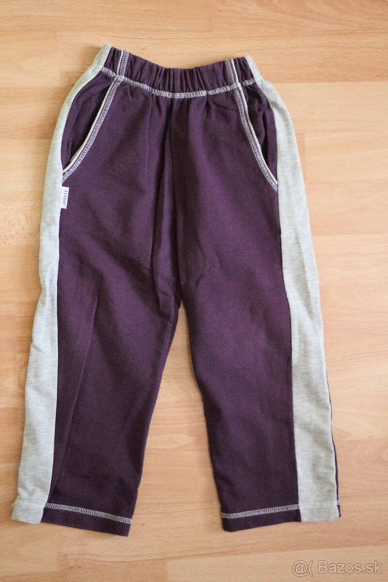 Nosené nepoškodené tepláky značky Tinko pre dievča, veľkosť 104. 100% bavlna. Tepláky sú v tmavofialovej farbe so sivými pásikmi na bokoch. Tepláky sú v pase na gumu a majú 2 vrecká