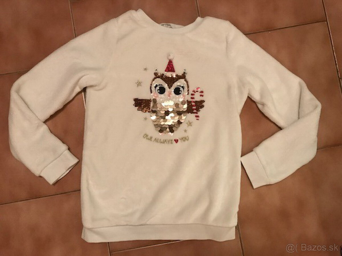 Teplá mikina (pulóver) v bielej farbe so sovičkou s flitrov pre dievča, značka H&M, veľkosť 134/140, materiál: 100% polyester