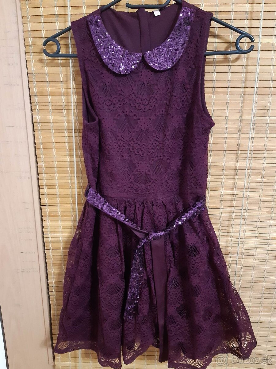 slávnostné šaty tmavej bordovej farby, zapínanie vzadu na skrytý zips, v páse látkový opasok, kombinácia čipky na šatách a flitrov na golieriku a opasku, saténová podšívka