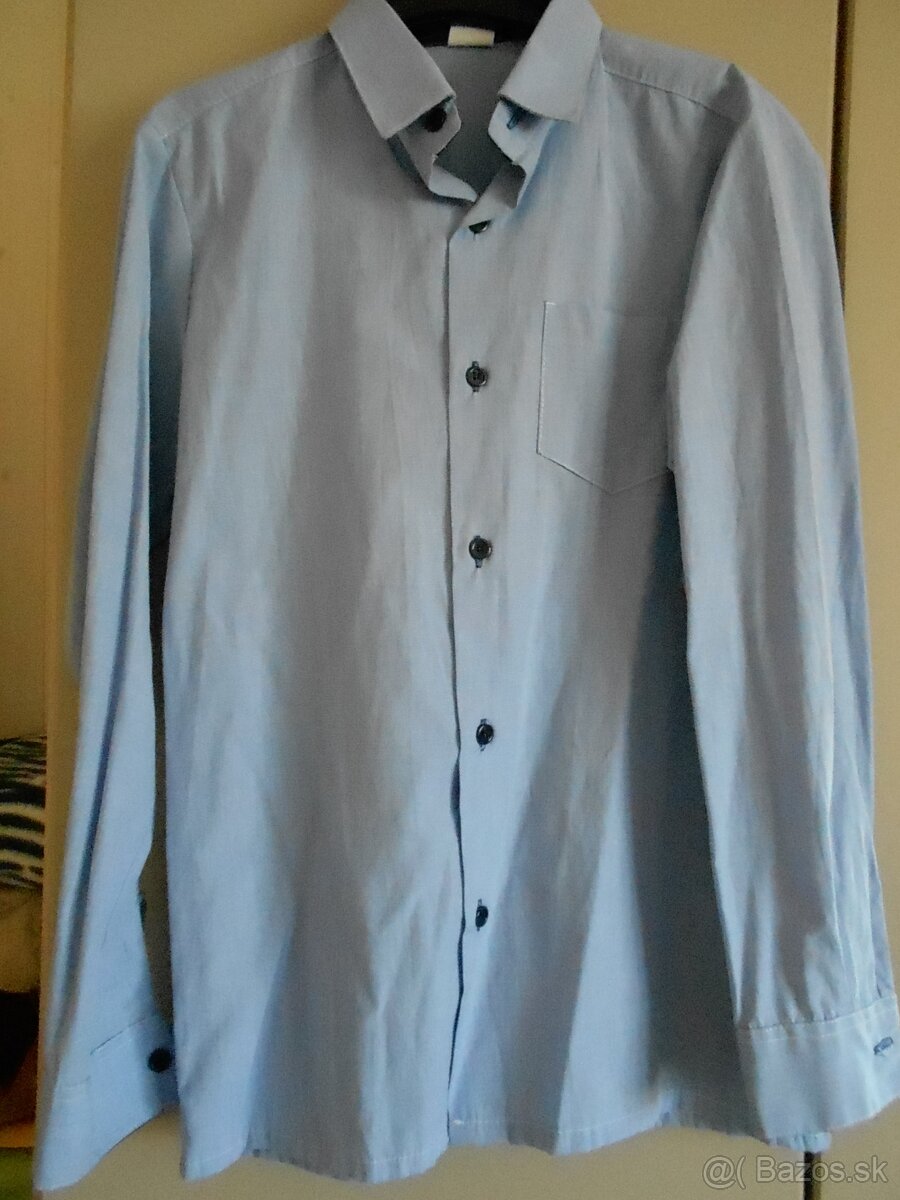 Predám modrú bavlnenú chlapčenskú košeľu č.34/146 do obleku 1x použitú, cena 5 eur.