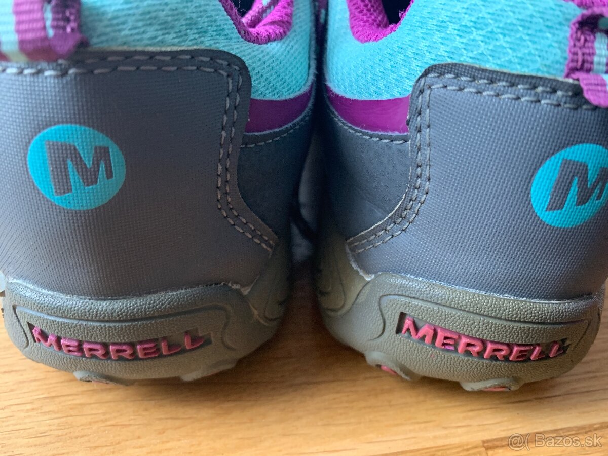 Detske turisticke topanky zn.Merrell vel.34EU kozene spicky farebna kombinacia sedej tyrkysovozelenej a ruzovej velmi dobry stav bez poskodeni. Vnutorna dlzka 22,5cm